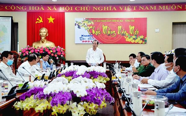 Ông Đặng Minh Thông, Ủy viên Ban Thường vụ Tỉnh ủy, Phó Chủ tịch UBND tỉnh (giữa); bà Lê Thị Thanh Bình, Phó Bí thư Thường trực Thành ủy, Chủ tịch HĐND TP. Vũng Tàu và ông Hoàng Vũ Thảnh, Phó Bí thư Thành ủy, Chủ tịch UBND TP. Vũng Tàu, chủ trì hội nghị.