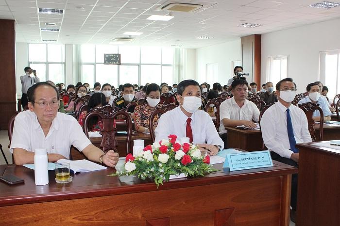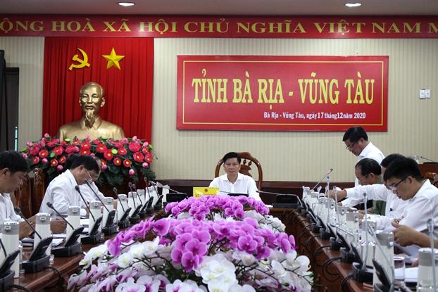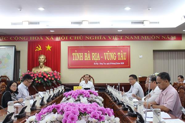 Ông Đặng Minh Thông, Ủy viên Ban Thường vụ Tỉnh ủy, Phó Chủ tịch UBND tỉnh (giữa); bà Lê Thị Thanh Bình, Phó Bí thư Thường trực Thành ủy, Chủ tịch HĐND TP. Vũng Tàu và ông Hoàng Vũ Thảnh, Phó Bí thư Thành ủy, Chủ tịch UBND TP. Vũng Tàu, chủ trì hội nghị.