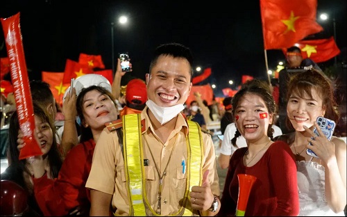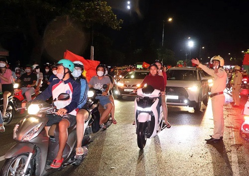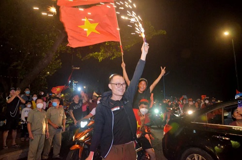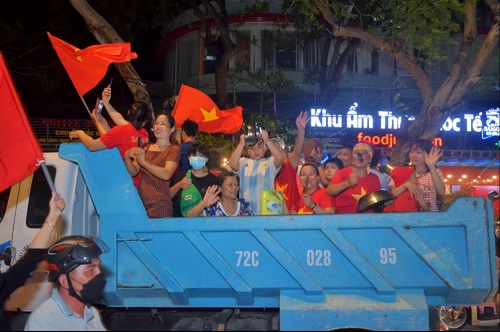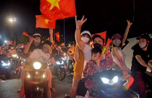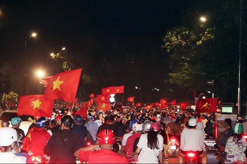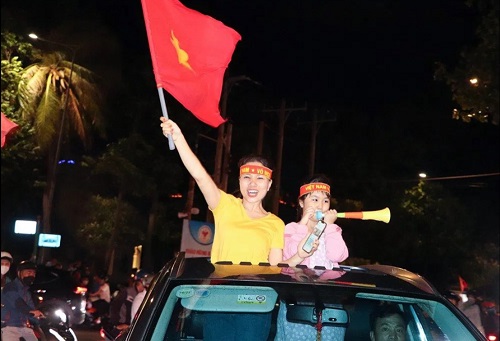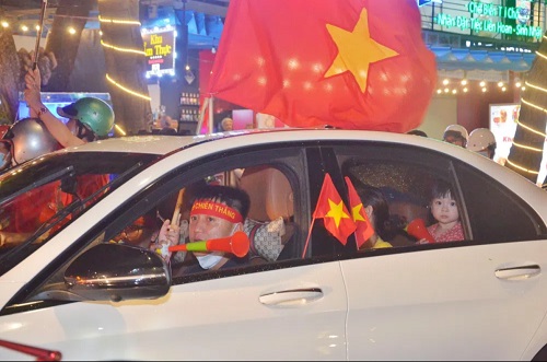 Hàng ngàn người dân, trong đó có nhiều gia đình chở nhau xuống đường chia vui với thành tích của đội nhà.